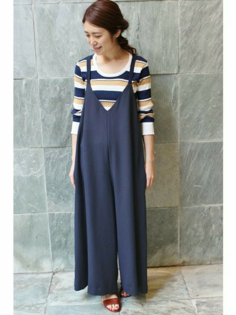 IENA by JULIE オールインワン スカートライクな女性らしいオールインワンには、マルチボーダーをインしてカジュアルに着こなして。