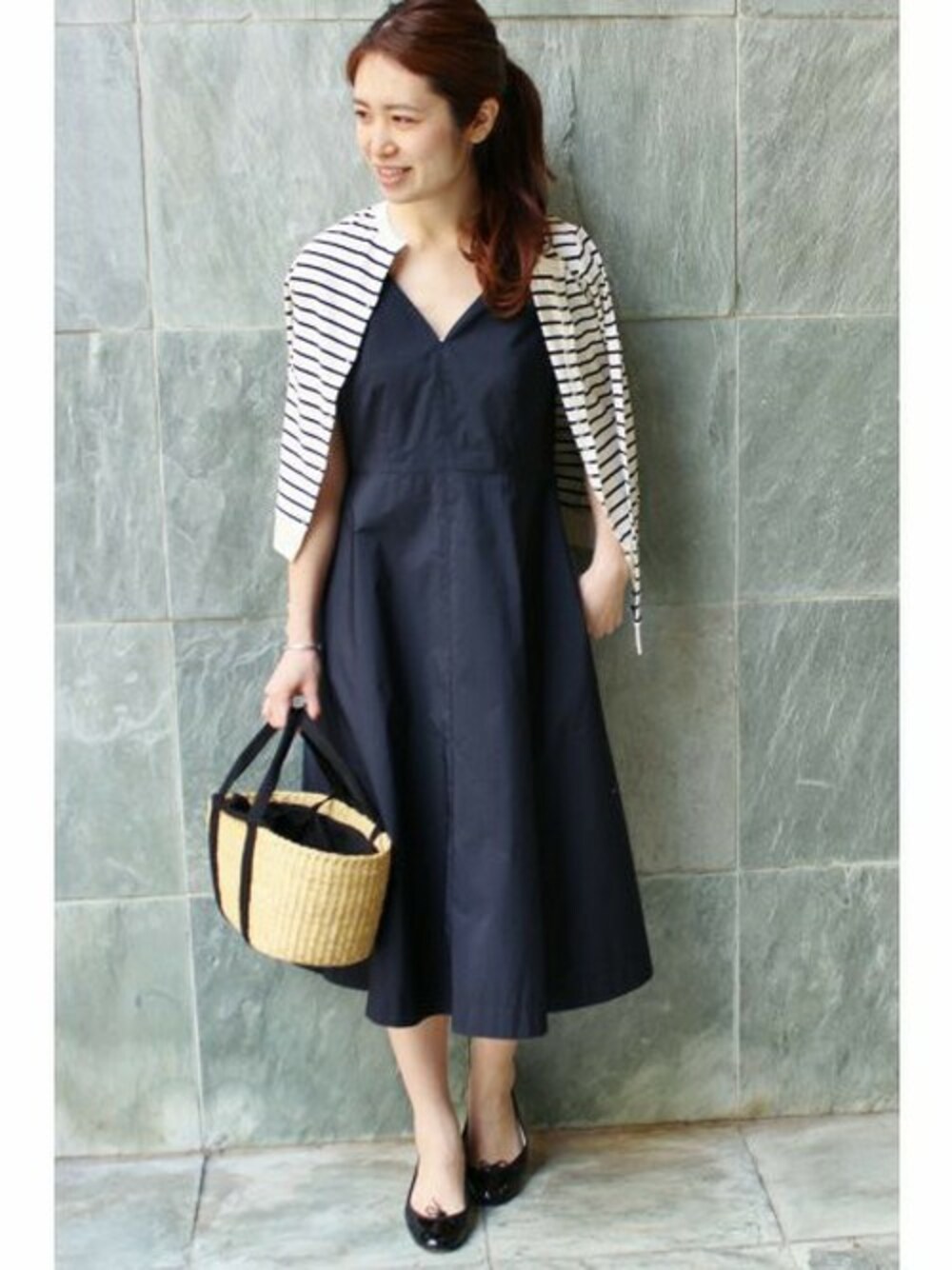 ふんわり広がるワンピース。 ボーダーカーディガンで甘すぎない着こなしに。