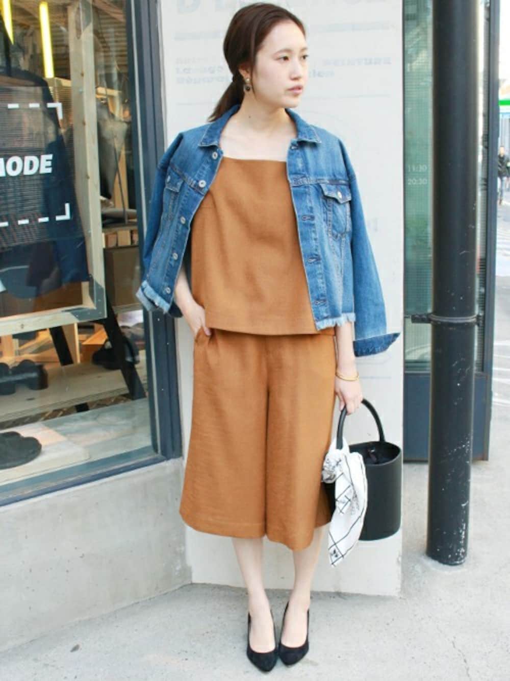 夏見えリネンライク素材のセットアップ。 カジュアルになりすぎないよう、足元はパンプスで大人っぽく。
