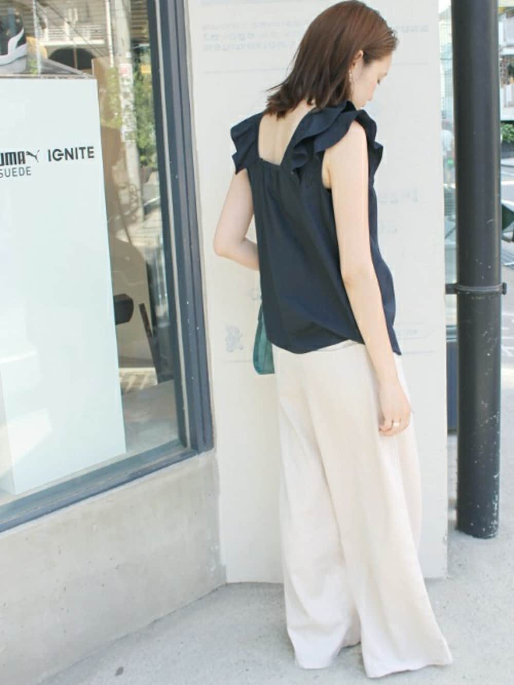 ラフな印象のワイドパンツ。 キレイめのブラウスと合わせた今年らしい大人のリラックススタイル。