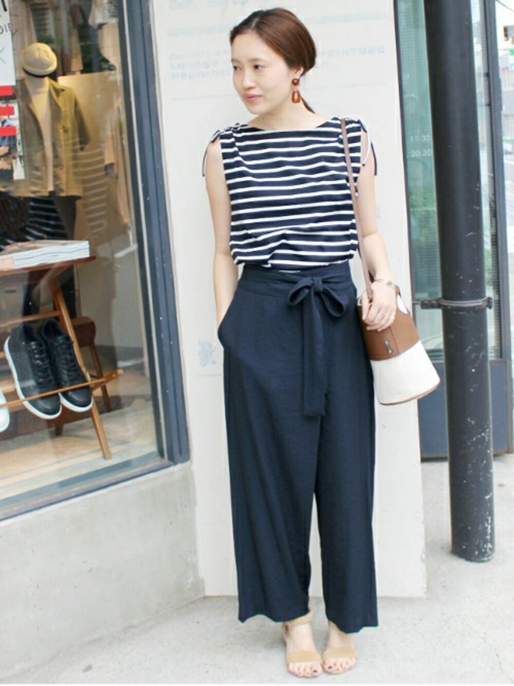 ウエストリボンのワイドパンツは夏らしいシャリ感のある素材が◎ ボーダーのカットソーと合わせた爽やかスタイル。 足首の出るクロップド丈はワイドパンツながらすっきり見せてくれ、女っぽさもプラスしてくれます。
