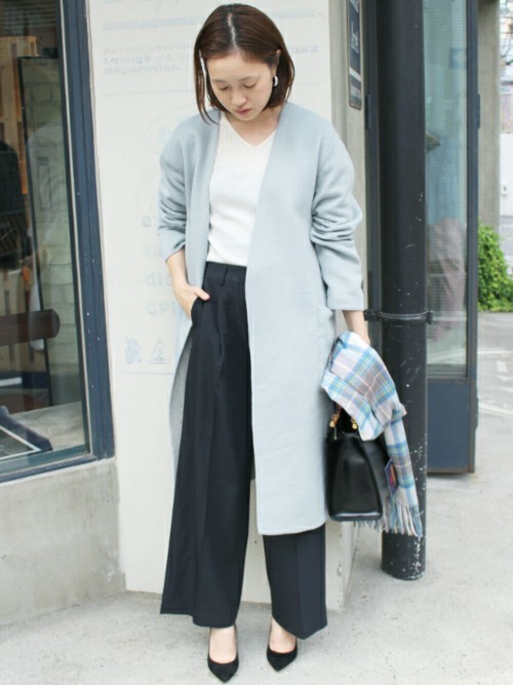 リバーシブルのノーカラーコート。 柔らかいサックスブルーできれいめにまとめてONスタイルに。