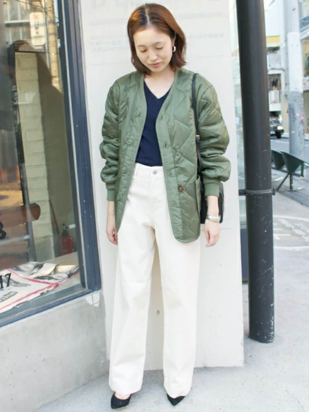 今年も引き続き注目のミリタリーライナーブルゾン。 カーキと相性の良いホワイトを合わせて上品に◎