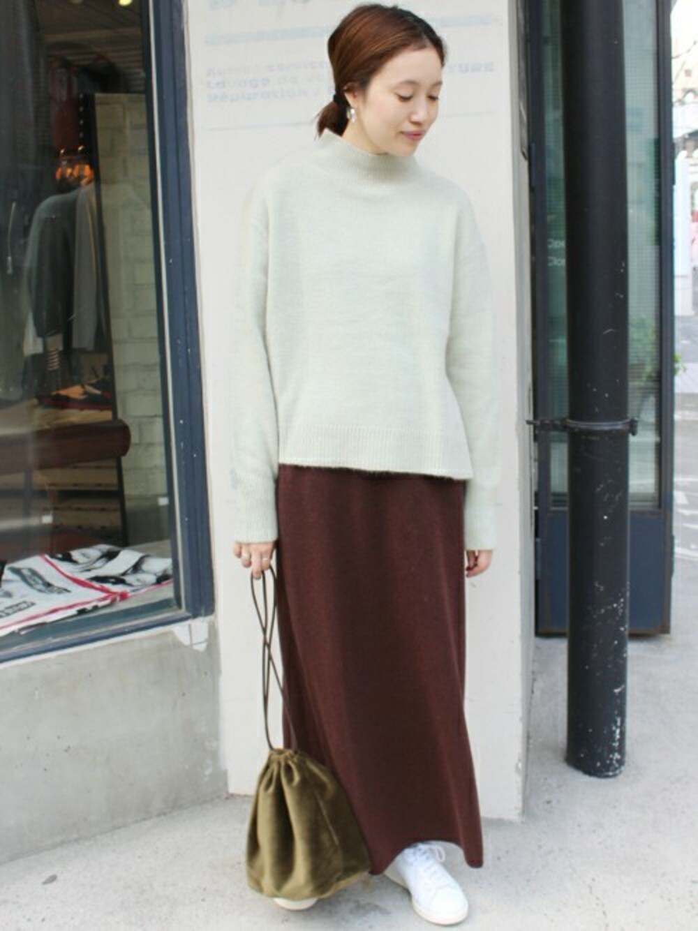 女性らしいファーニットは、ロングスカートあわせで今年らしく。 シンプルなデザインなのでカラーで遊ぶのがおすすめです◎
