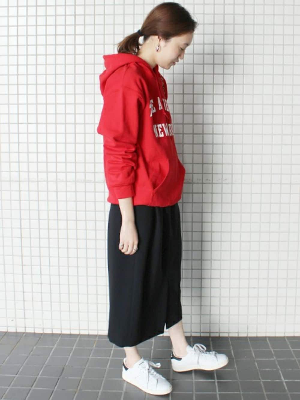 鮮やかなカラーが目を惹くロゴパーカー。 赤を引き立たせるために他のアイテムはモノトーンでまとめました◎