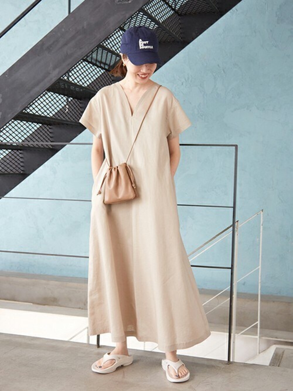 ◆リネンハーフスリーブワンピース リラックス感のあるリネン混の素材のワンピース。 スッキリと女性らしく見えるよう襟ぐりのあきにこだわりました。 ところどころに入れたステッチのデザインがアクセントになる1枚。 ********************** 【スタッフ着用コメント】 《スタッフ名:Sally》 年齢:30代前半/身長:162cm/体型:細身/普段サイズ:M/着用サイズ:フリー サイズ感:くるぶしが見えるくらいの着丈。身体のラインを拾わないゆとりのあるシルエット。 素材感: 清涼感のある麻混素材。 着心地: とても楽で、リラックス感ある着心地。真夏でもストレスフリーで着れそうです。 **********************