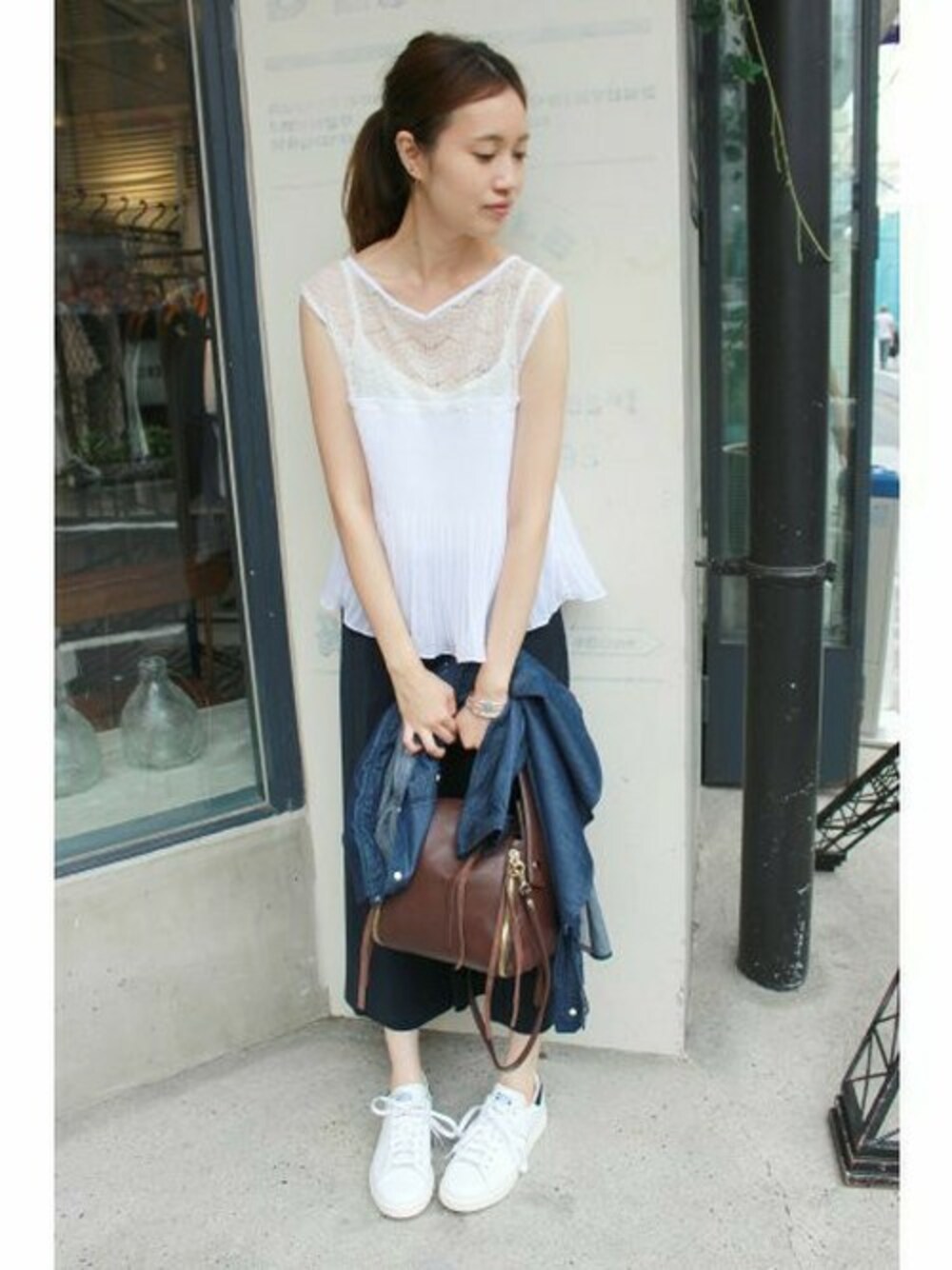 甘めのレースブラウスにはシックな色味のボトムで引き締めて! 小物使いで早くも秋仕様に★