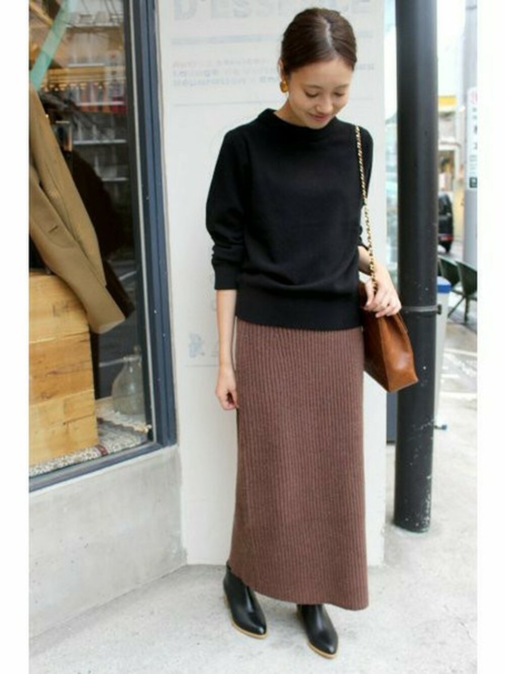 こっくりとしたブラウンでシーズンライクなコーディネート。 ロング丈のニットスカートは、大人にまとまります。
