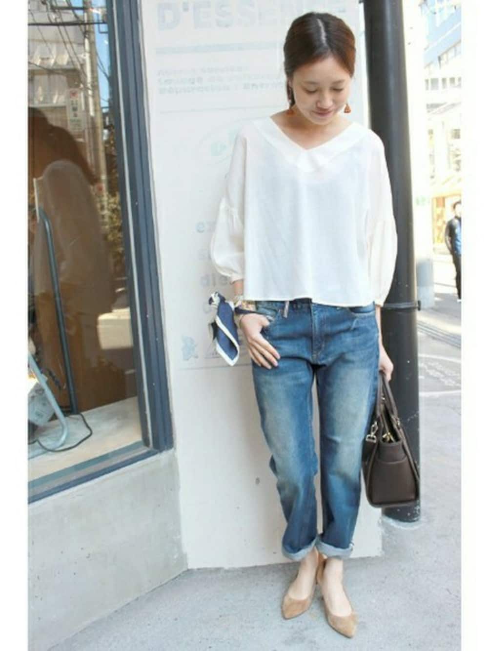 ロールアップした裾から見える赤耳が可愛い! ちょこっと素肌見せ+パンプスで、ボーイフレンドデニムも女性らしく着こなせます。