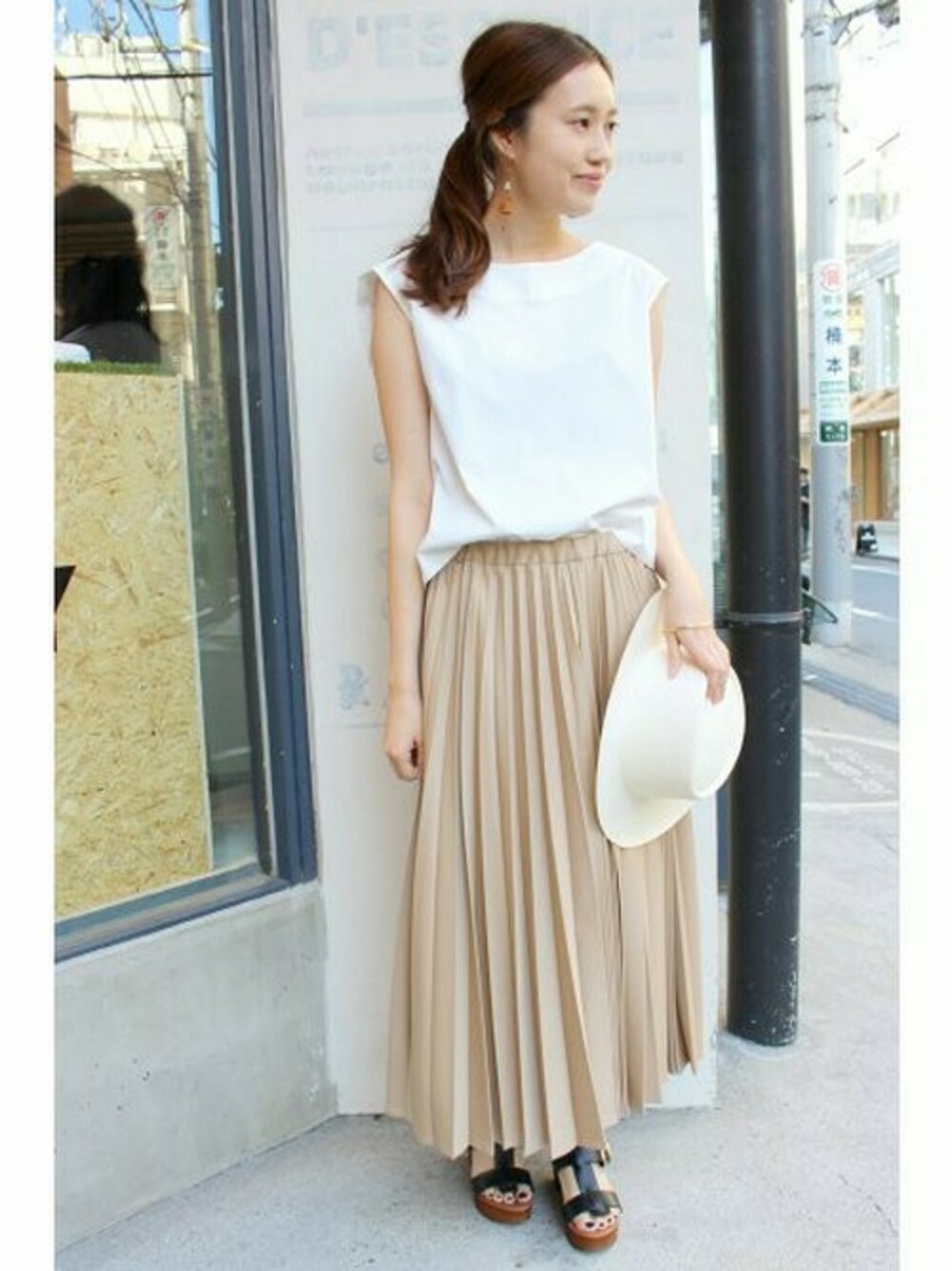 ハリ感があるブラウスは、シンプルなデザインで着まわし抜群! 同系色のコーディネートは、素材感でメリハリをつけて。