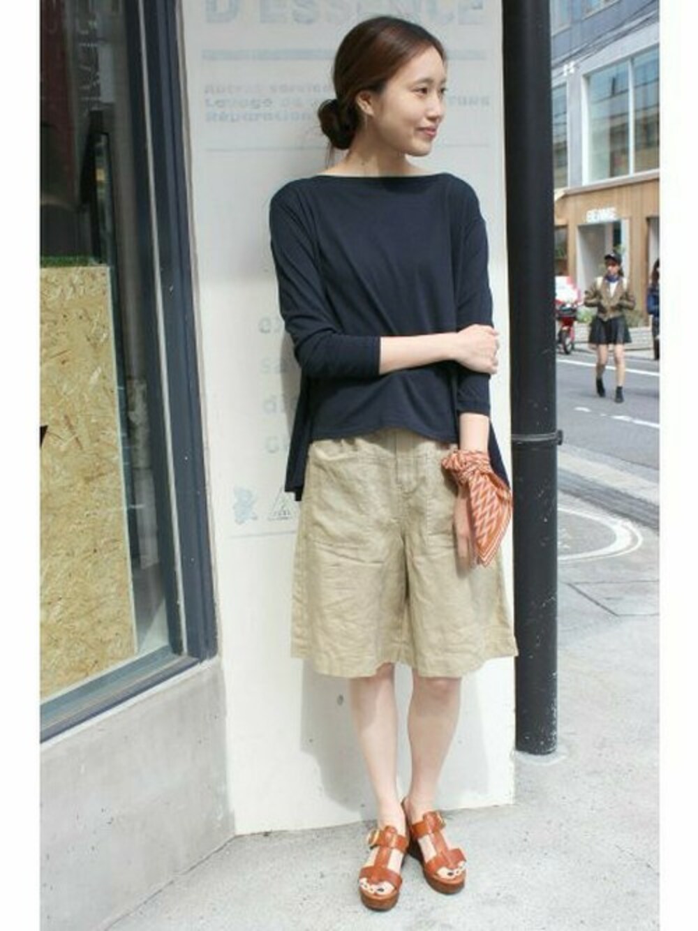 カジュアルなハーフパンツ。 デコルテの見えるボートネック合わせで女性らしいスタイリングに。