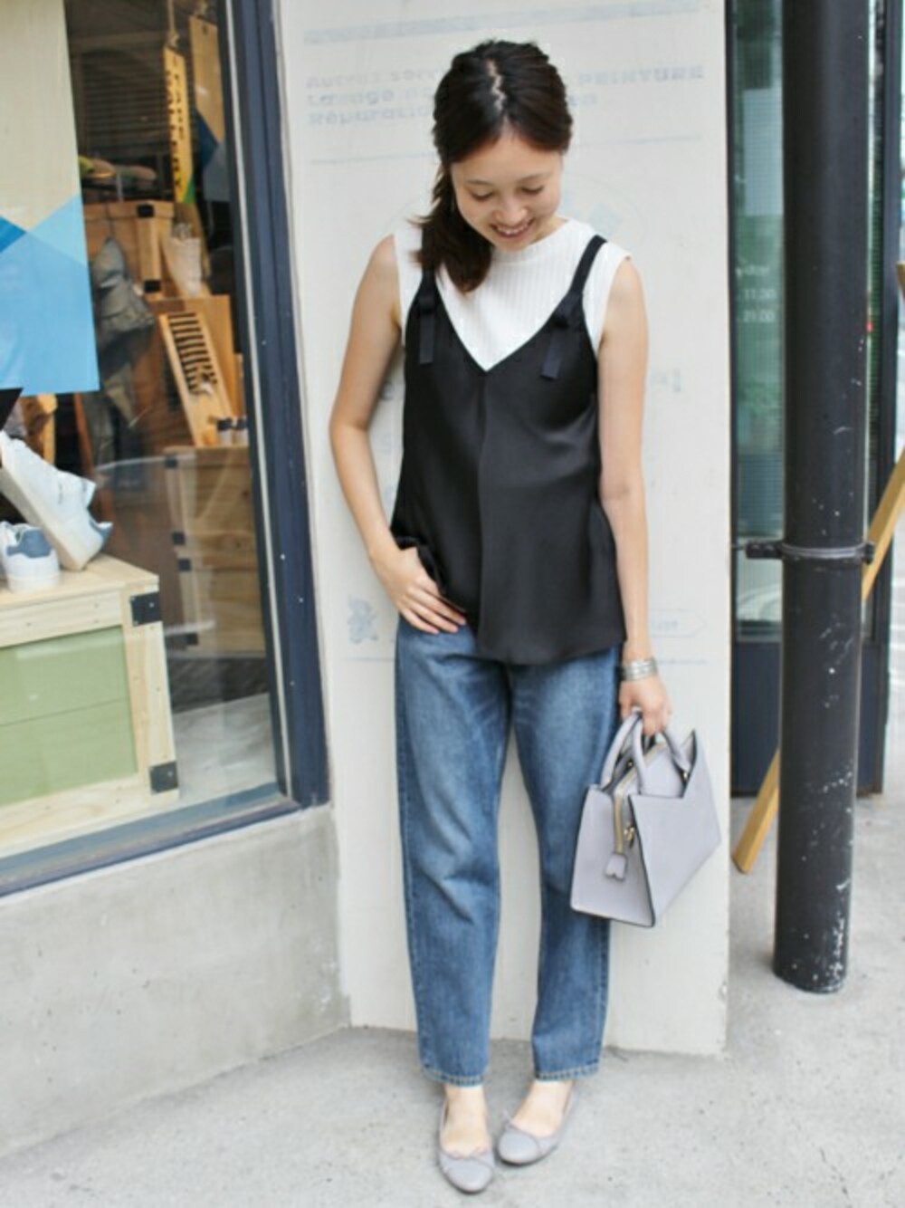 今年らしいキャミソールのレイヤードスタイル。 サテン地なのでカジュアルになりすぎず、上品な印象です。