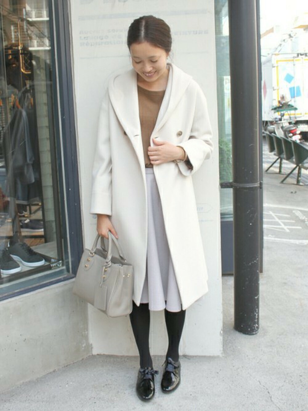 今年らしく肩を落としても着用出来る大きめなフードコートをフレアスカートでシンプルに女性らしくスタイリングしました。大きめなフードは小顔効果もあります。