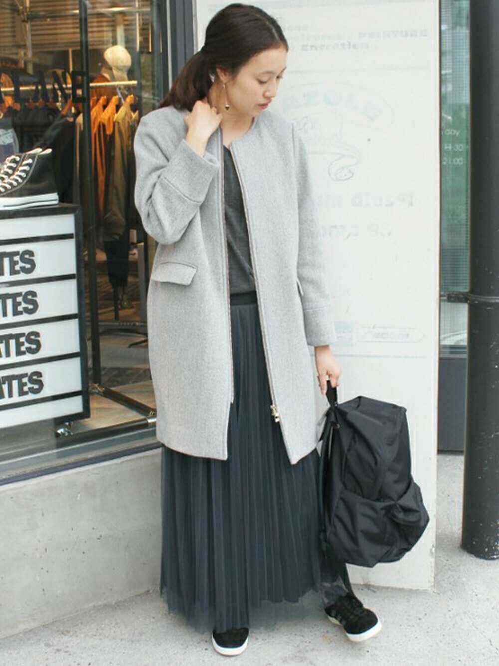 ロング丈のアイテムを合わせて縦のラインを強調したスッキリとしたIラインコーデ。