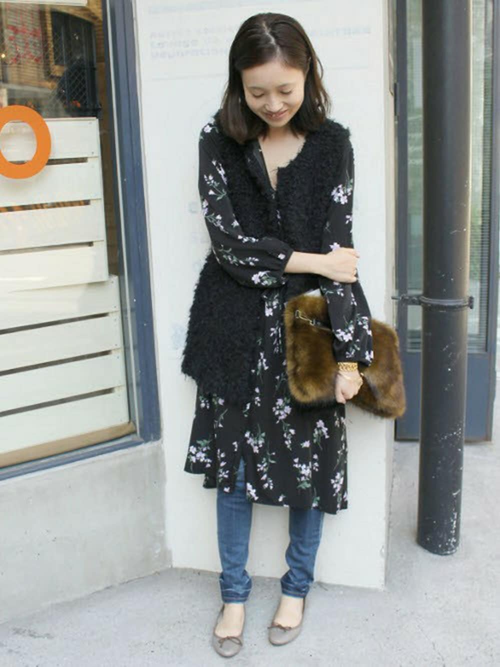 女性らしい花柄ワンピースにファーベスト。 デニムとのレイヤードスタイルもサマになります。