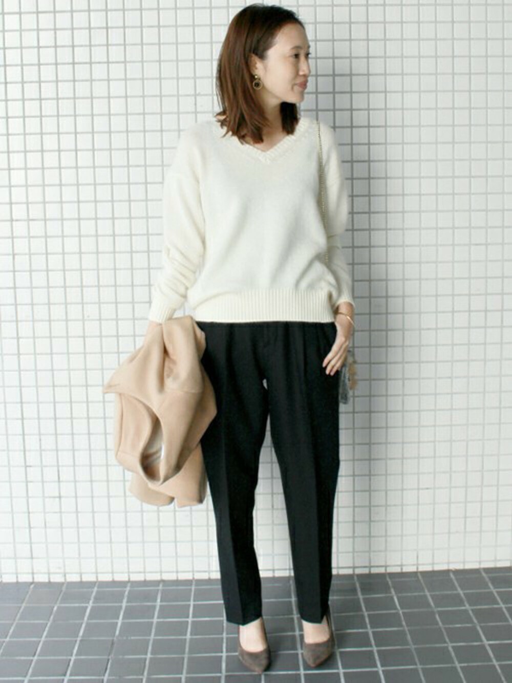 オーバーサイズが今年らしいVネックニット。 モノトーンのカラーが大人の雰囲気。