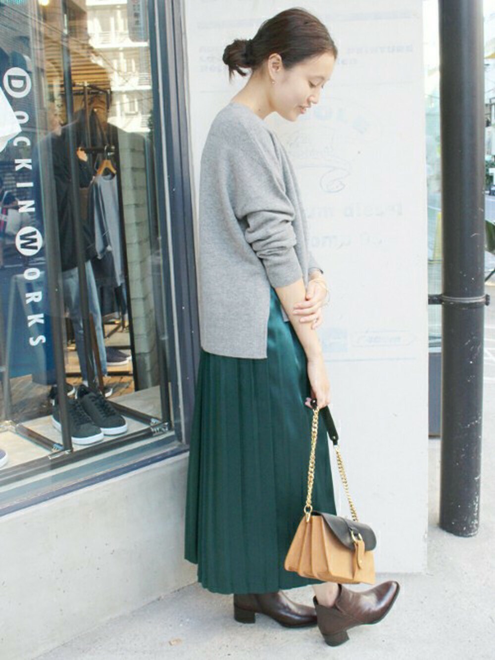 シルク素材のプリーツスカート。 ざっくりニットと合わせれば今年らしい装いに。