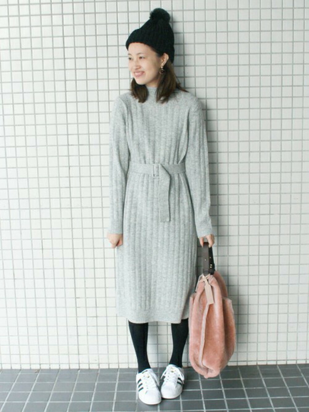 ベルト付きのニットワンピースです。 リブ仕様なので今年らしいトレンドさもプラスさせました。