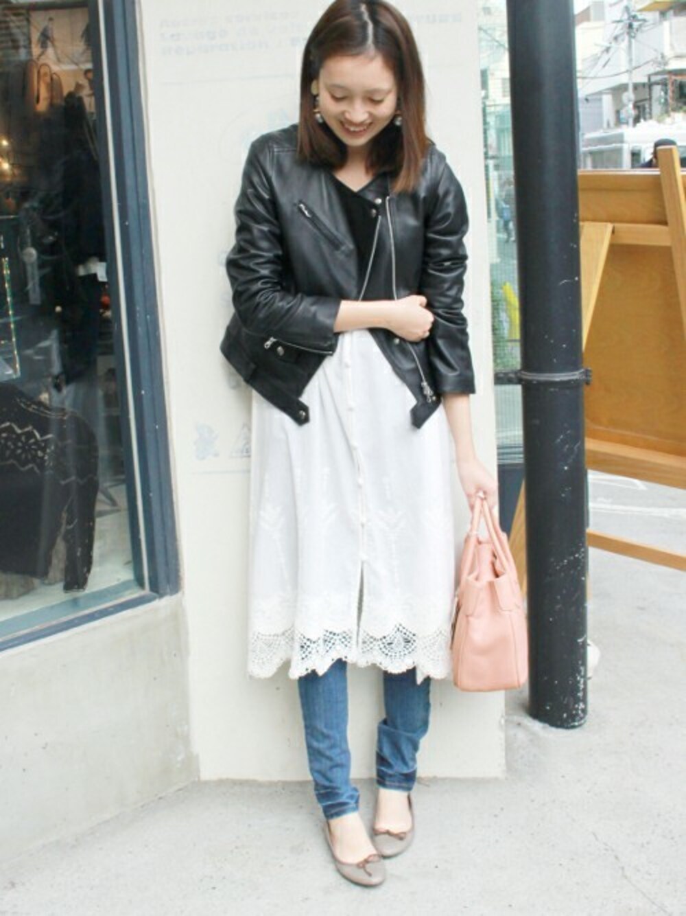 メンズ要素の強いライダースはレースと合わせて女性らしく着こなして。
