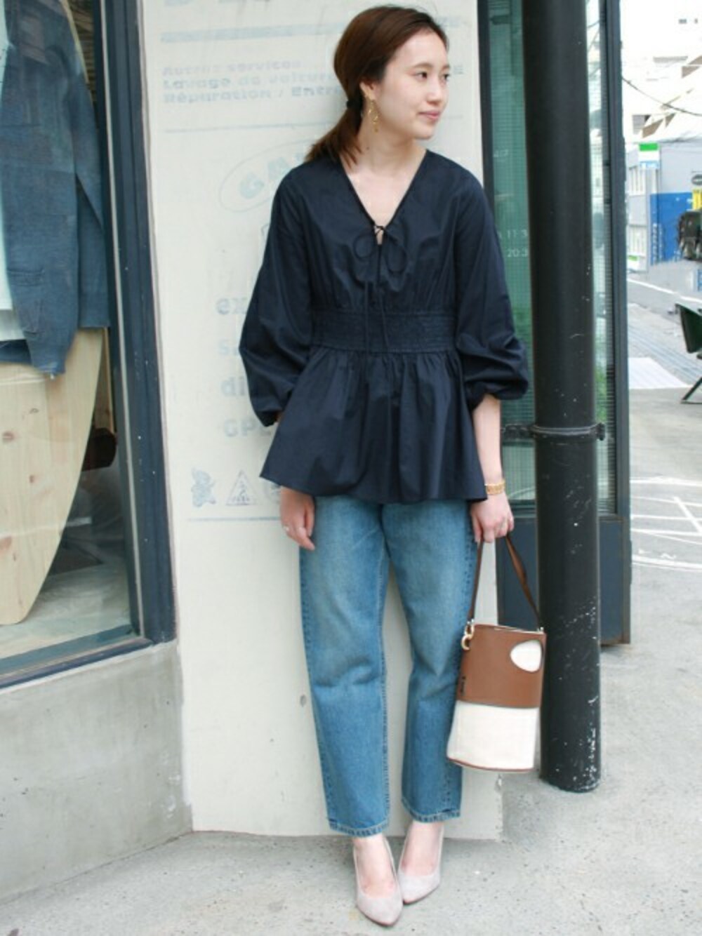 シャーリング使いがポイントのブラウス。 ボトムを選ばず、着まわしの効くアイテム。 シンプルにデニムで合わせてもサマになります。
