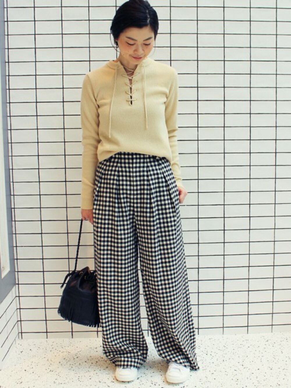 ワイドパンツコーデ ギンガムチェックのワイドパンツがコーデの主役! レースアップニットでトレンドを押さえたカジュアルスタイルに。