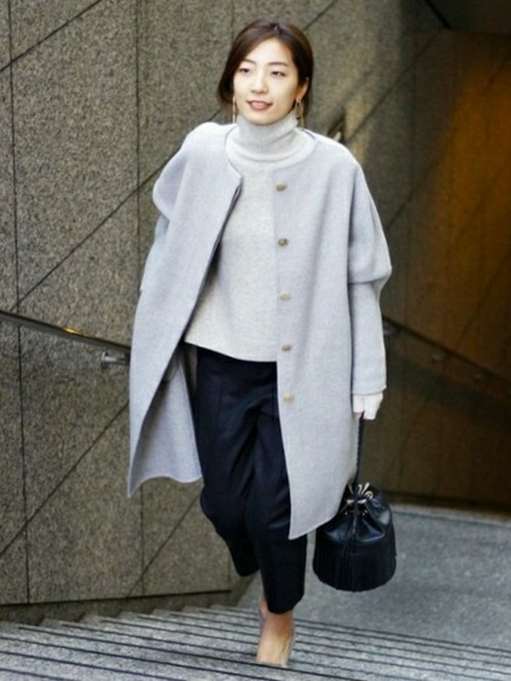 ゆるっとしたシルエットがお気に入りのノーカラーコート。 普段の通勤にもさっと羽織れる着心地のよさもおすすめの一枚。 手元にあわせたグローブも、今年買い揃えたアイテムのひとつ。 小物までニュアンスカラーでまとめたスタイリングがこの冬お気に入り。