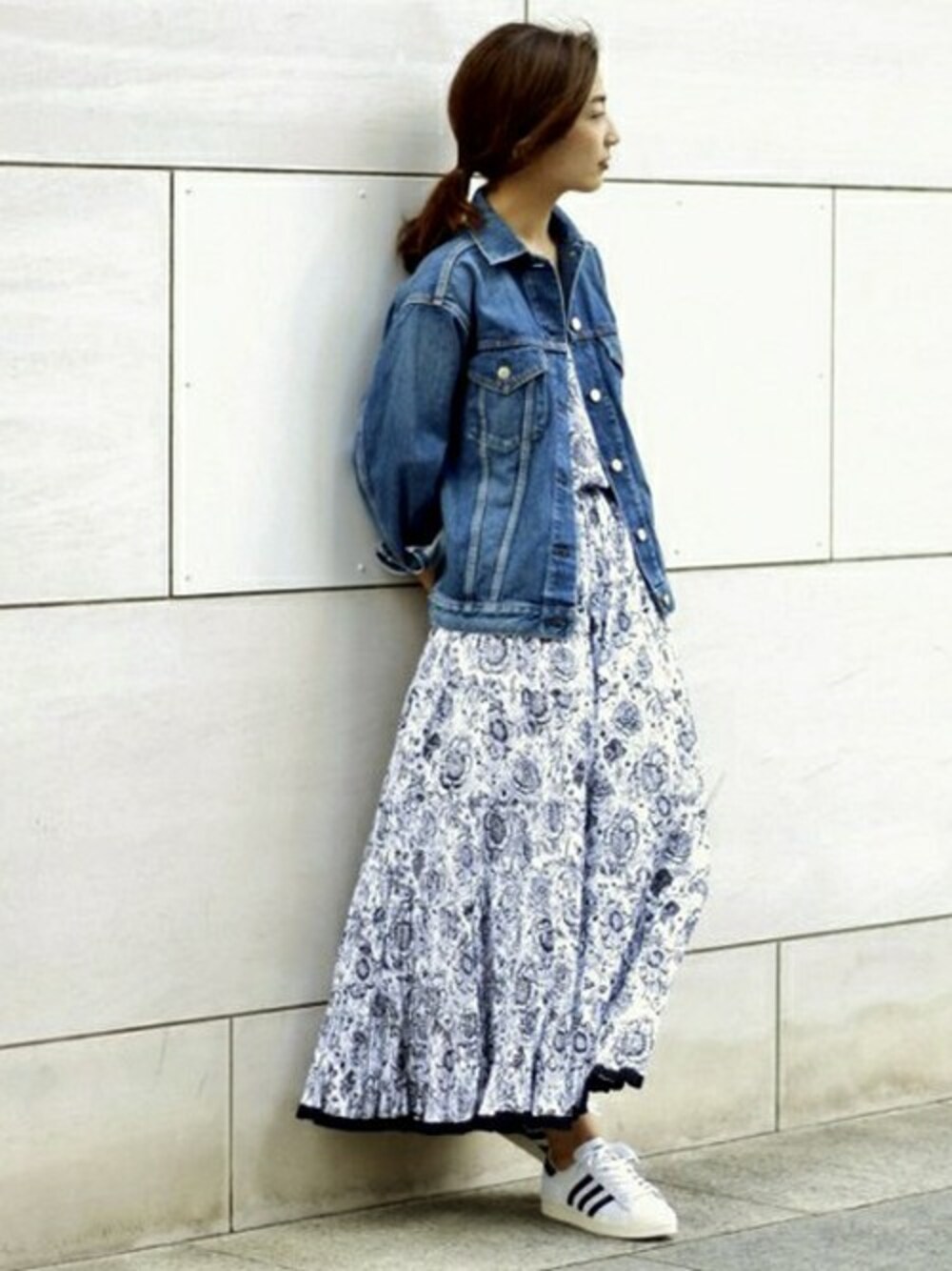 デニムのブルゾンとお気に入りのスニーカーを合わせれば、リゾート柄のワンピースも街にぴったりな雰囲気に。。