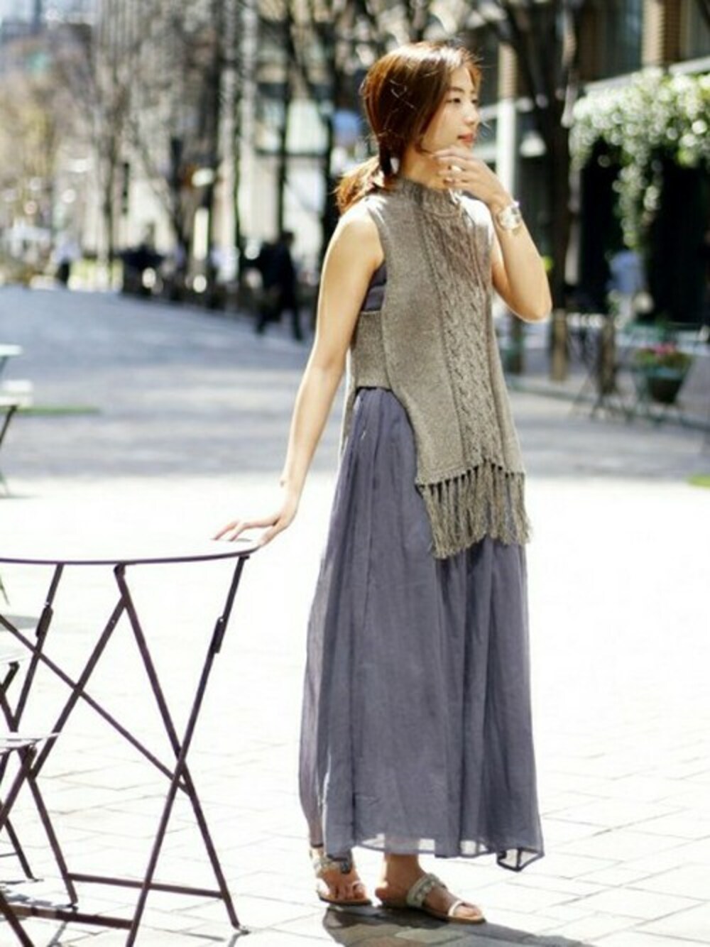フリンジ使いが今年らしいノースリーブニットでさり気なくリゾート感を。 大人のリラックススタイルがおすすめです。 シルバーの小物使いでクリーンな印象に…