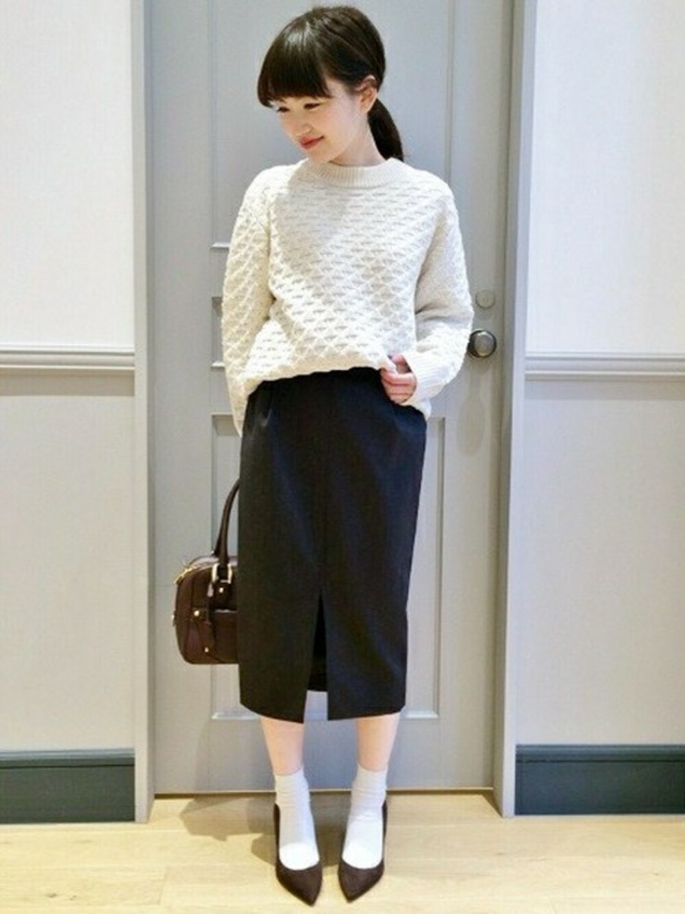 今シーズントレンドのゆったりニットにタイトスカートをあわせて。 袖のフォルムが可愛いですね。