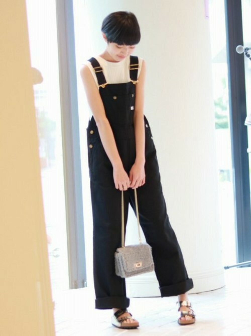 LEEとの別注オーバーオールに、PLAKTONのサンダルを合わせてスポーティなスタイルに。 インナーには引き続きトレンドのリブカットソーを合わせて旬な着こなしに。