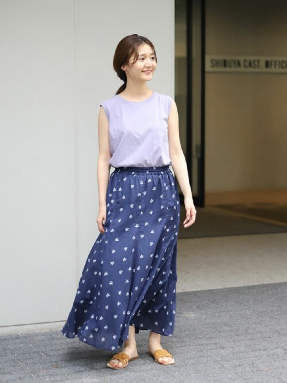 ◆コットンボイルフレアロングスカート さりげないフラワーの刺繍が散りばめられたネイビー。 パープルのノースリーブで、ほっこりしすぎない旬なカラー合わせに。 ********************** 【スタッフ着用コメント】 《スタッフ名:Chika》 年齢:20代半ば/身長:158cm/体型:普通/普段サイズ:S/着用サイズ:フリー サイズ感:ウエストがゴムなので窮屈感なく履けます。足首が隠れるくらいの丈感。 素材感:柔らかく通気性がいいコットン素材。 着心地:とても軽くさらっとしているので涼しく履けます。透け感も気になりませんでした。 **********************