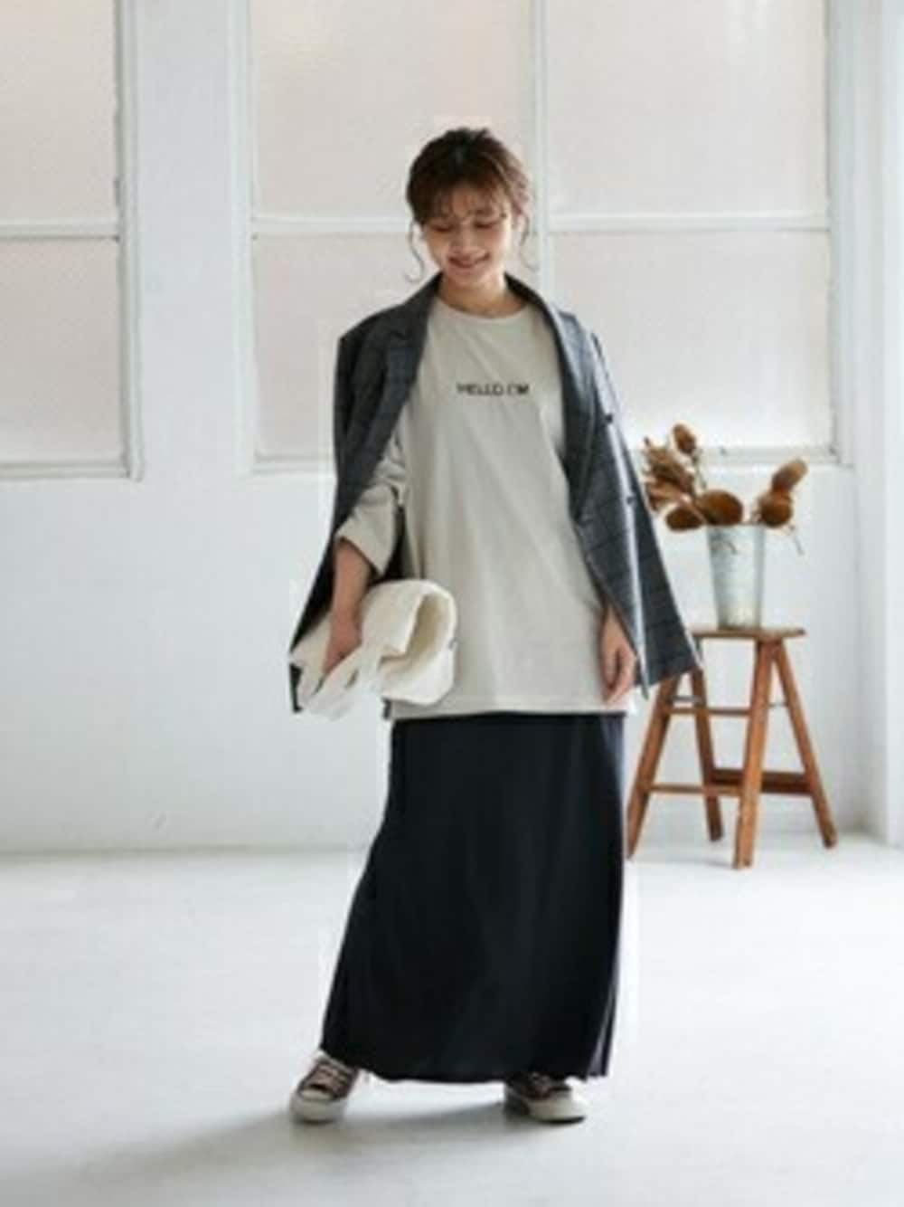 ◆HELLO.IMロンTEE ヒップもすっぽりと隠れる着丈のロゴTシャツ。 落ち感あるスカートやジャケットと合わせて カジュアルになりすぎないようスタイリングしました。 ********************** 年齢:20代半ば/身長:158cm/体型:普通/普段サイズ:S/着用サイズ:フリー サイズ感:全体的にゆったりとしたサイズ感。袖丈も長めです。 素材感:柔らかく、肌触りのよいコットン素材。 着心地:肌当たりが滑らかで着心地良かったです。 **********************