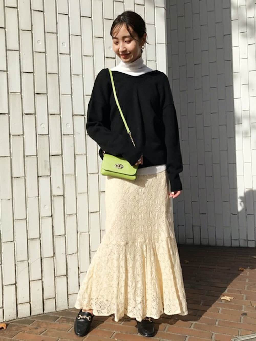 レースのマーメイドスカートは甘くならないようにモノトーンでまとめてみました。 色味がシンプルな分素材感でメリハリを! グリーンのバッグを差し色に!