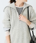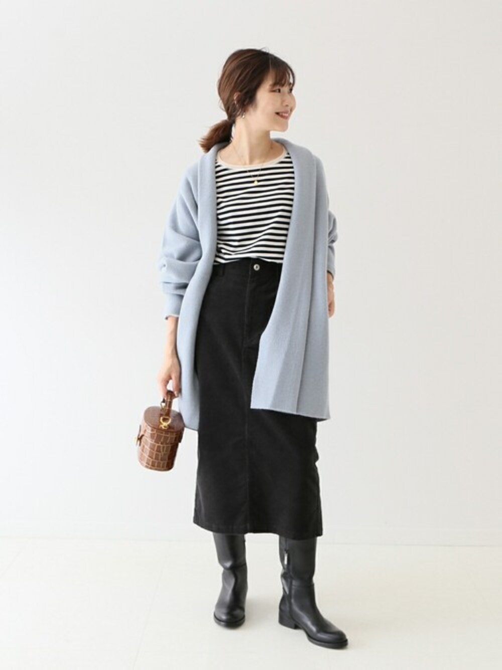 ◆コクーンニットショートガウン もっちりした肌触りが心地良いガウン。 色味は、優しいブルーで肌馴染みが良く どんなコーデとも相性抜群。 今回は全体をモノトーンでまとめ落ち着いたコーデに 仕上げました。