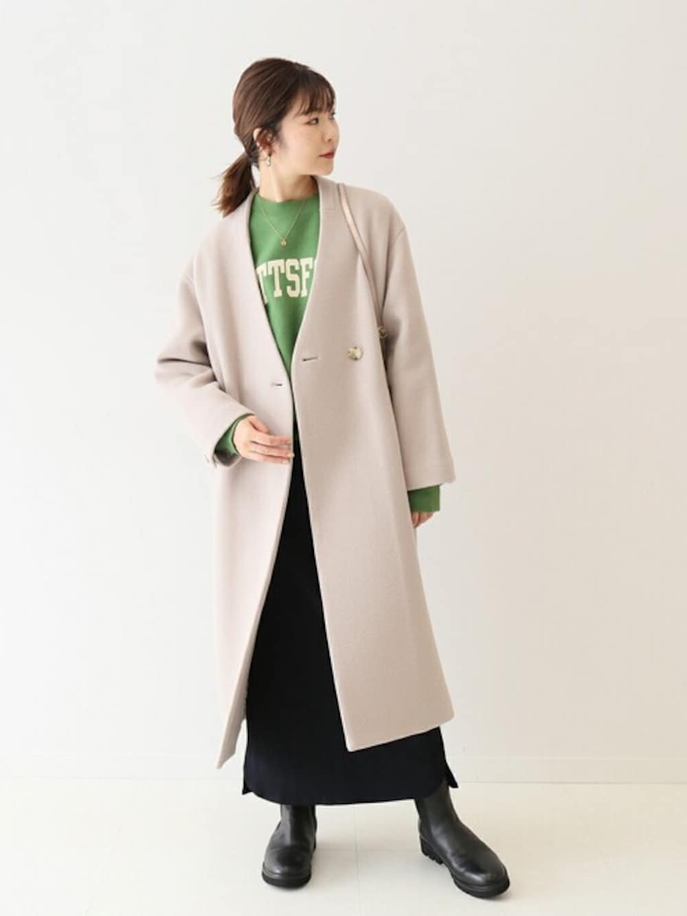 Yuriのノーカラーコート「Super100 ダブルモッサVネックノーカラーコート◆」を使ったコーディネート
