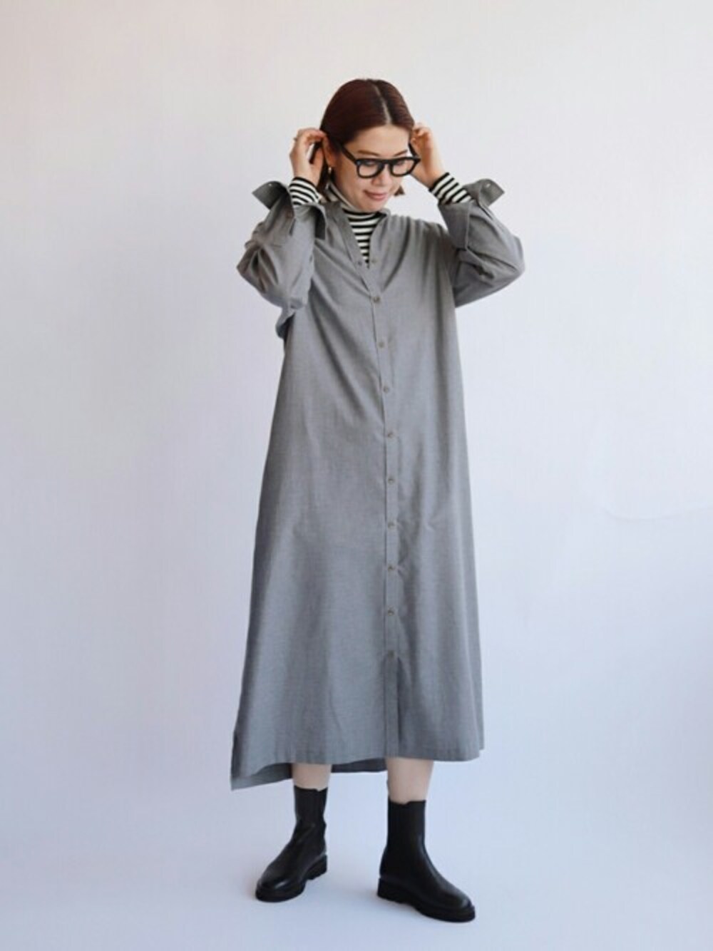 ◆コットンネルシャツワンピース 季節の変わり目に1着あると嬉しいベーシックなシャツワンピース。 私は少しシックに大人っぽく着たかったのでグレーをチョイスしました。 程よいハリ感とゆったりしたシルエットが身体のラインを拾わず 透け感もないので安心感のある着心地でした。 小物を黒にまとめて、ボーダーのタートルをポイントにレイヤードしました。 袖部分からもちらっと見せるとこなれ感がアップします◎ ◉165cm/高身長/普通体型/普段着用サイズ:38〜40 【Instagram】 @sakotn2 お気に入りのスタイリングなどをご紹介しています!