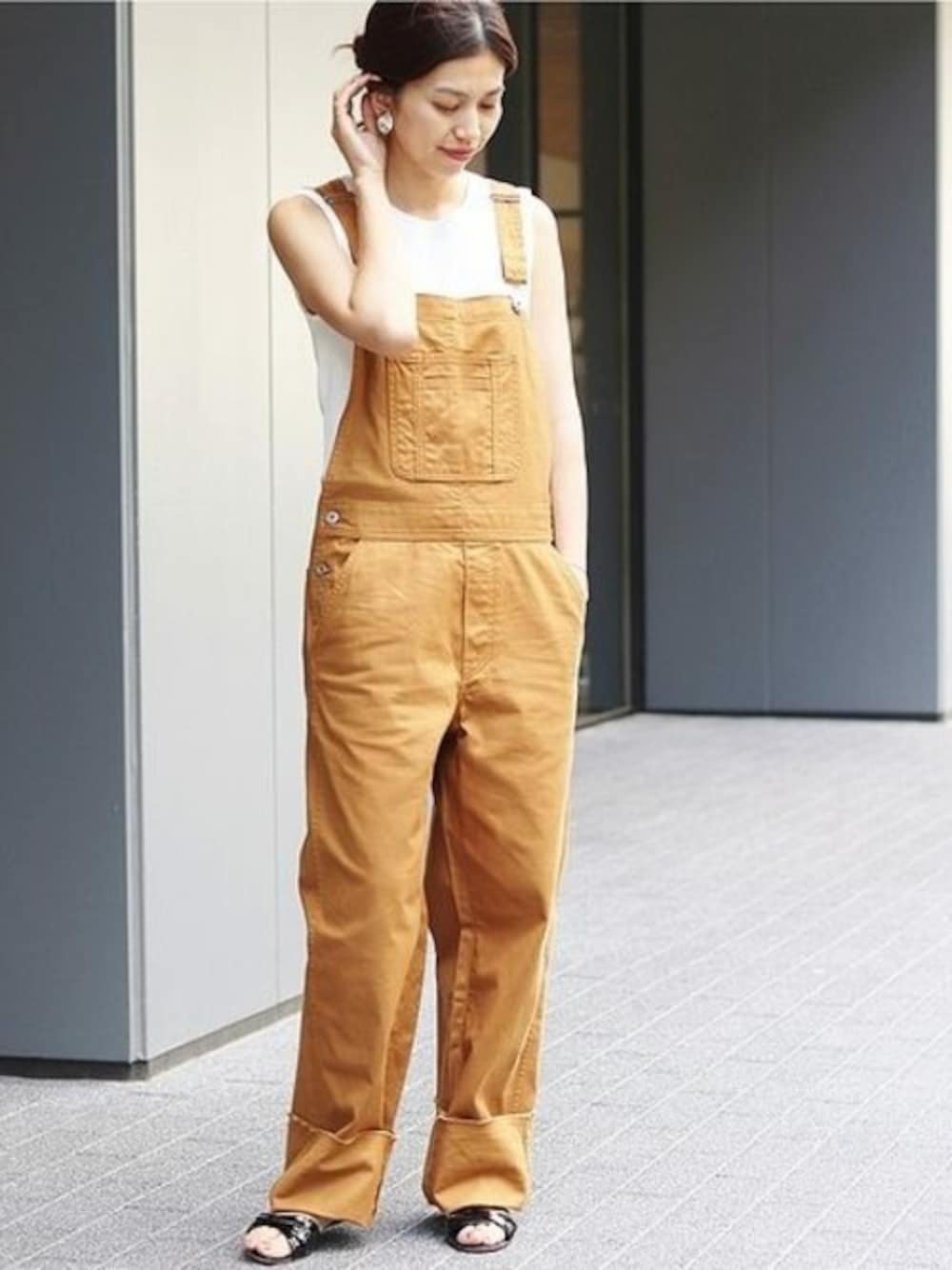 こっくりキャメルのオーバーオール。 ゆったりとリラックス感のあるシルエットが◎ サーマル素材のカットソーをインナーに。