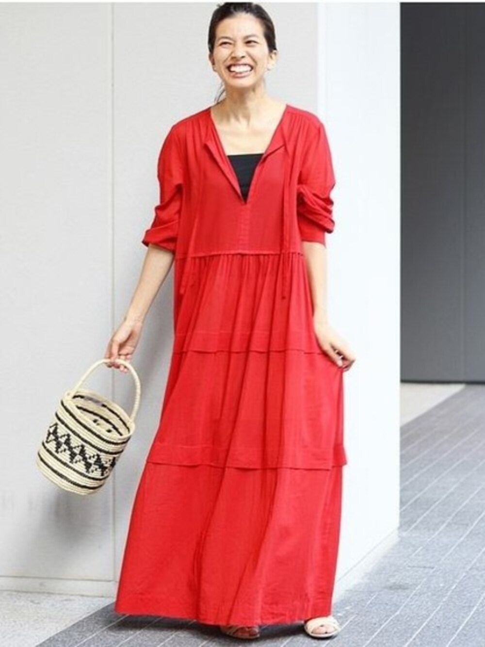 ふんわりとエアリーな質感でマキシ丈でも軽やかさが魅力の一枚。 軽やかな素材だからカラーアイテムも着こなしやすい。