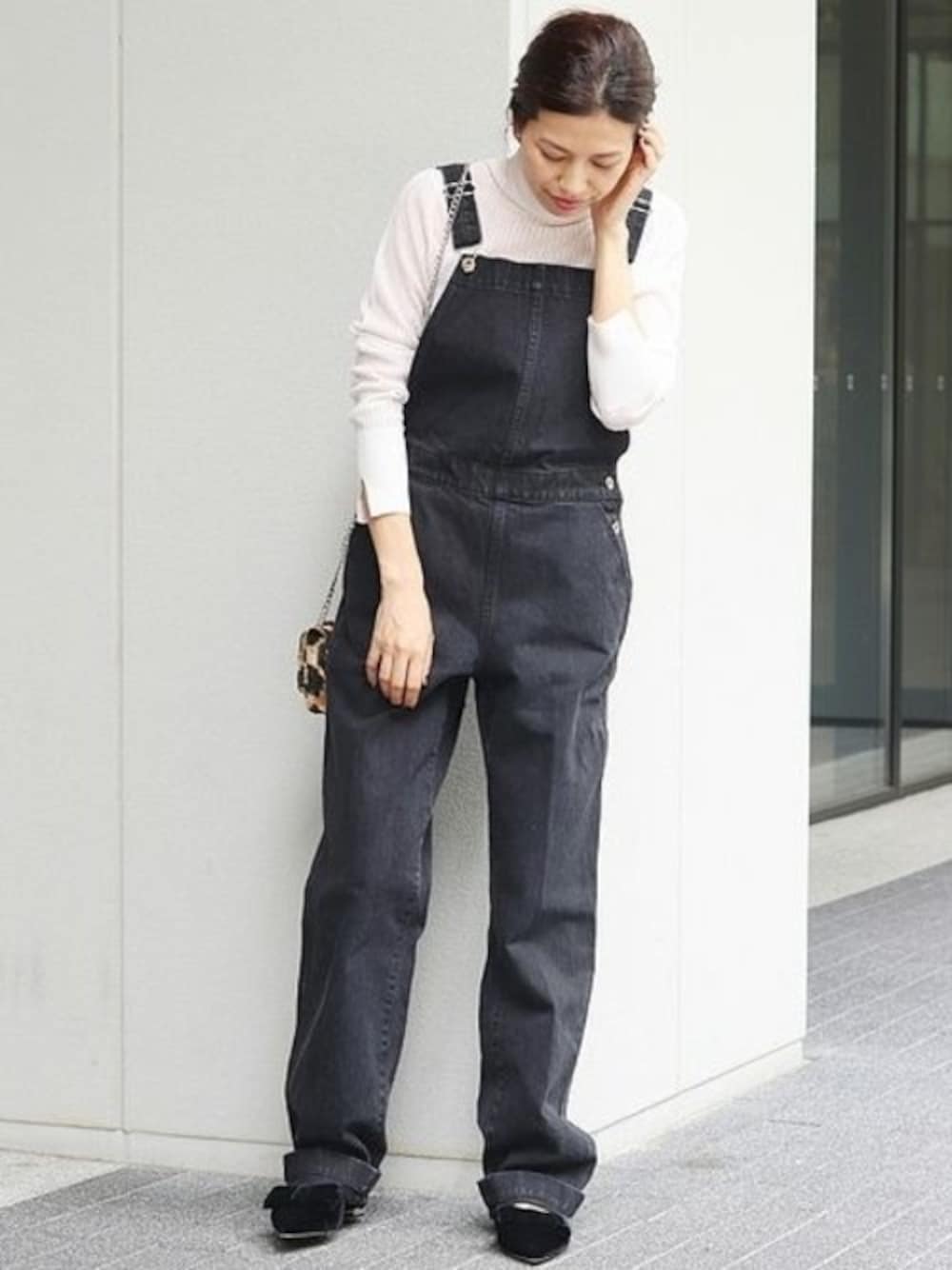 カジュアルなオールインワンにシアー感がレディなタートルニットをインナーに。 袖口のスリットもさりげないデザインポイント。