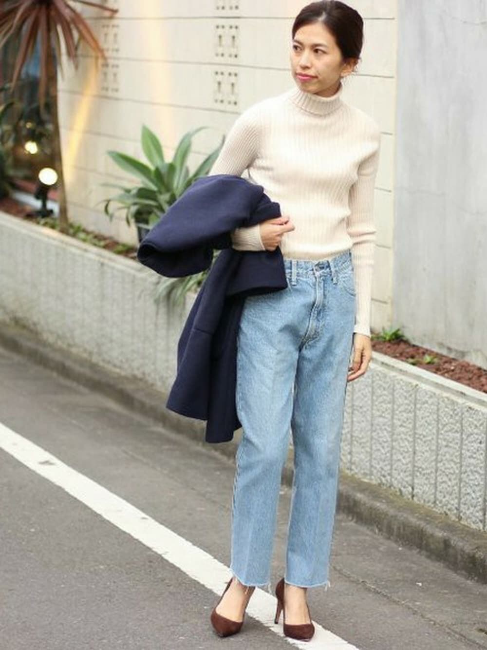 変型リブのタートルネック。 程よいフィット感と抜群の着心地のよさですっきりと着れるお気に入りアイテム。 カットオフデニムでぬけ感のあるきれいめカジュアルに。