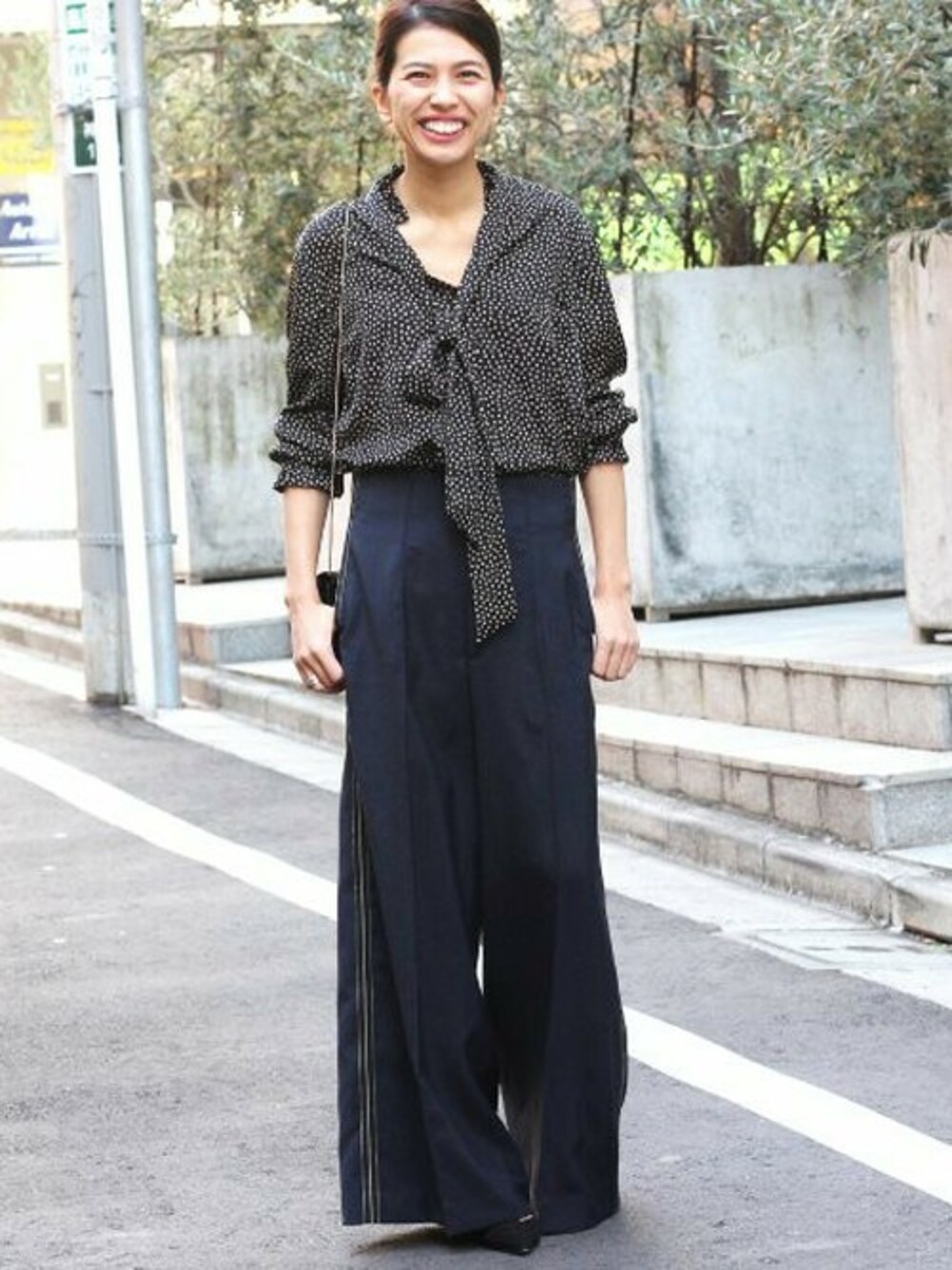 ドットブラウス。 ボウタイの付いたフェミニンなブラウスにスポーティでマニッシュなワイドパンツを合わせて。