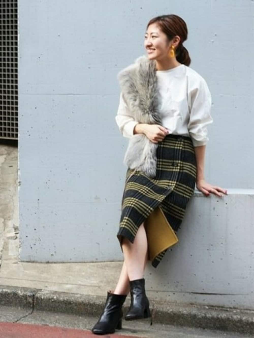 チェック柄も、レディなロングタイトシルエットを選ぶのがおすすめ。ファーやショートブーツで上品に仕上げて。柔らかくふんわりとした素材感が、冬まで穿ける人気の素材です。