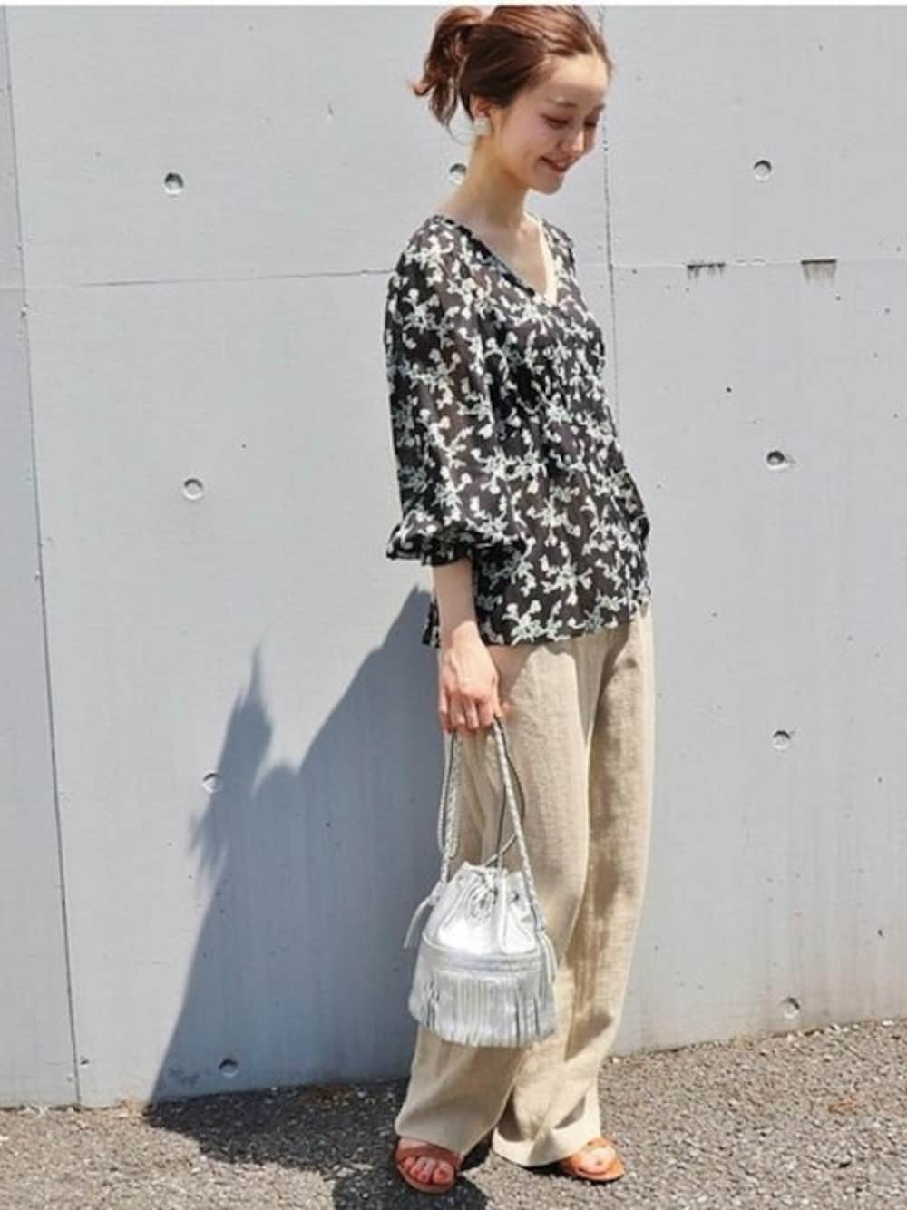 涼しげに着られるフラワープリントブラウス。 フェミニンなアイテムなのでワイドパンツで甘くなりすぎないようスタイリング。
