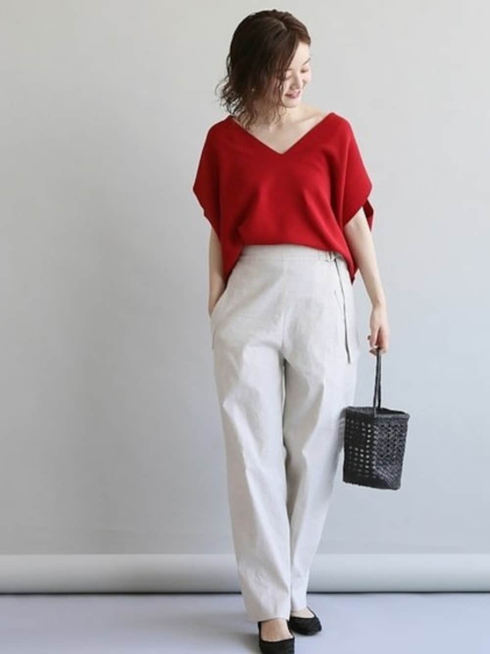 体型カバー力の高いアイテムなら赤も気負わず取り入れやすくておすすめ。 赤に加えてブラックも新しく入荷*