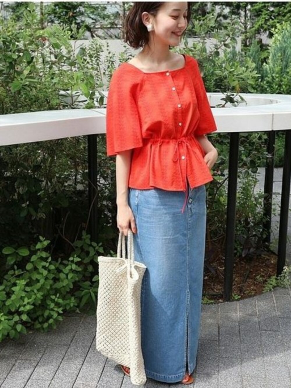 鮮やかなドビーブラウスをデニムスカートでカジュアルに。 ウエストを絞るデザインなので、マキシ丈スカートと繋げるように合わせても◎