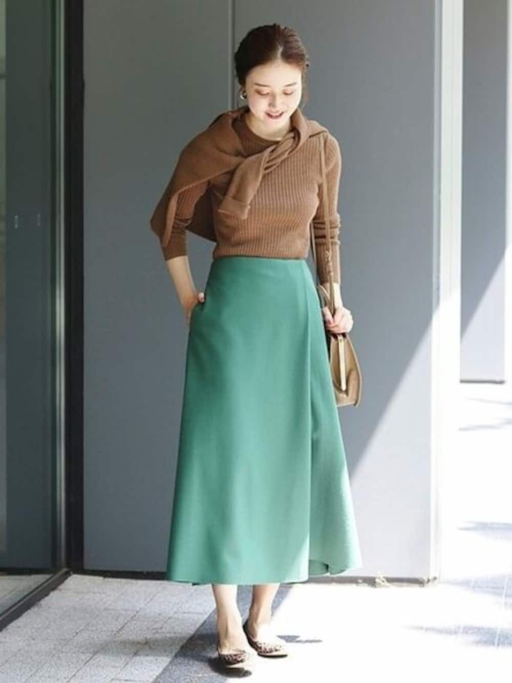キャメルやベージュをふんだんに取り入れた着こなしのポイントに最適なグリーン。 腰周りがすっきりとしたスカートなので、コンパクトなトップスをインすると◎