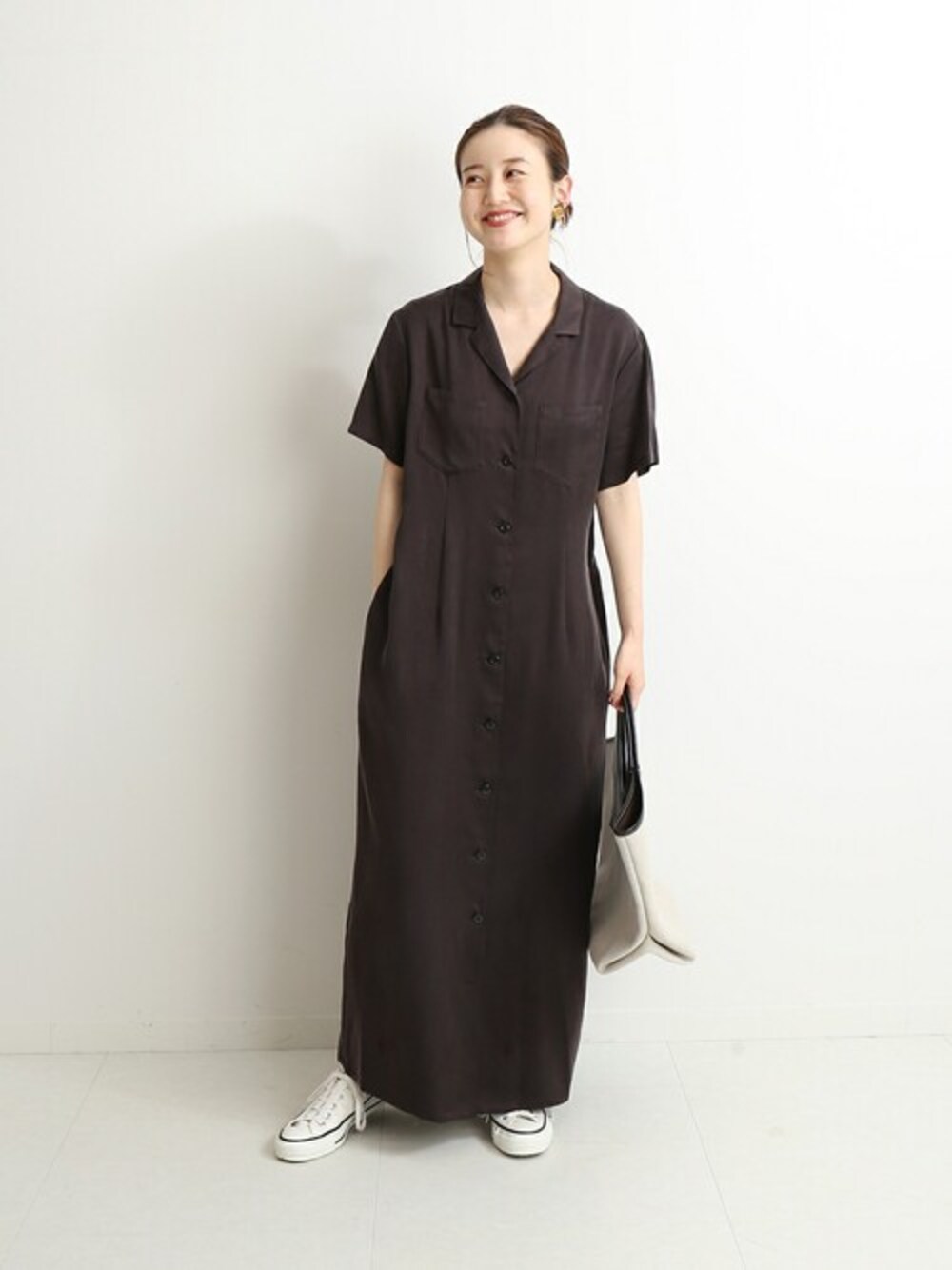 色味と素材感が大人な印象のシャツワンピース。 ウエストにはタックが入っていて、着るだけで女性らしいシルエットに。 クラシカルなワンピースをスニーカーでハズしてデイリー仕様にしました◎