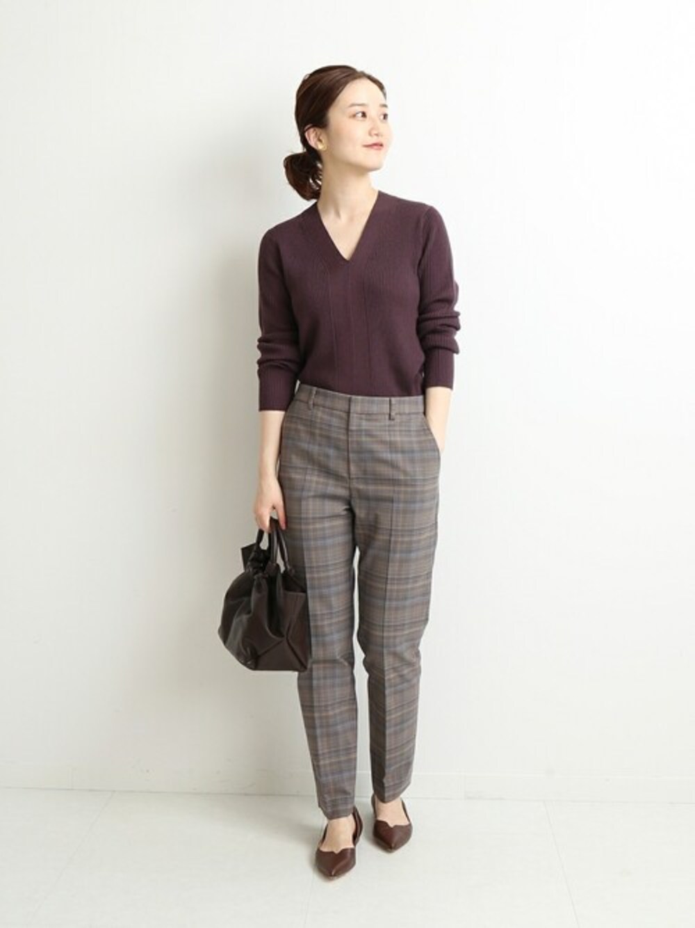 首元の空きとフィット感のあるシルエットが女性らしいリブプルオーバー。 ブラウンのようにも見える、深みのあるパープルのカラーが大人っぽくて素敵です。 秋らしいチェックのスティックパンツと合わせて、オンでも使えるスタイリングに。