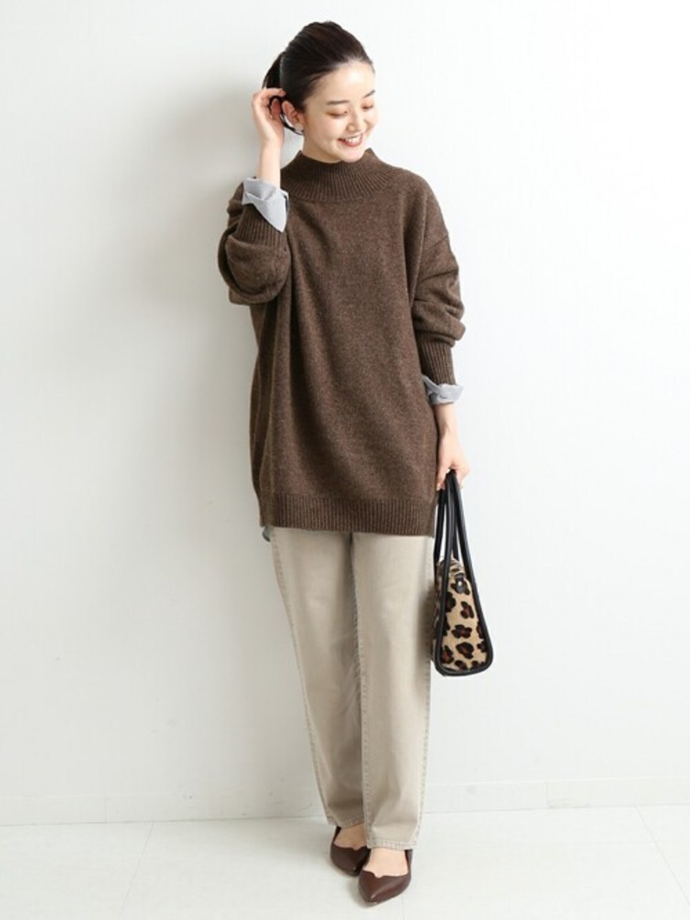 柔らかいメランジ調の風合いが素敵なハイネックニット。 ネックが高すぎないので、タートルが苦手な方も取り入れやすいアイテムです。 シャツをレイヤードしてちらりと見せると一気にこなれ感がアップ。 ブラウン系のワントーンコーディネートに奥行きがプラスされます◎