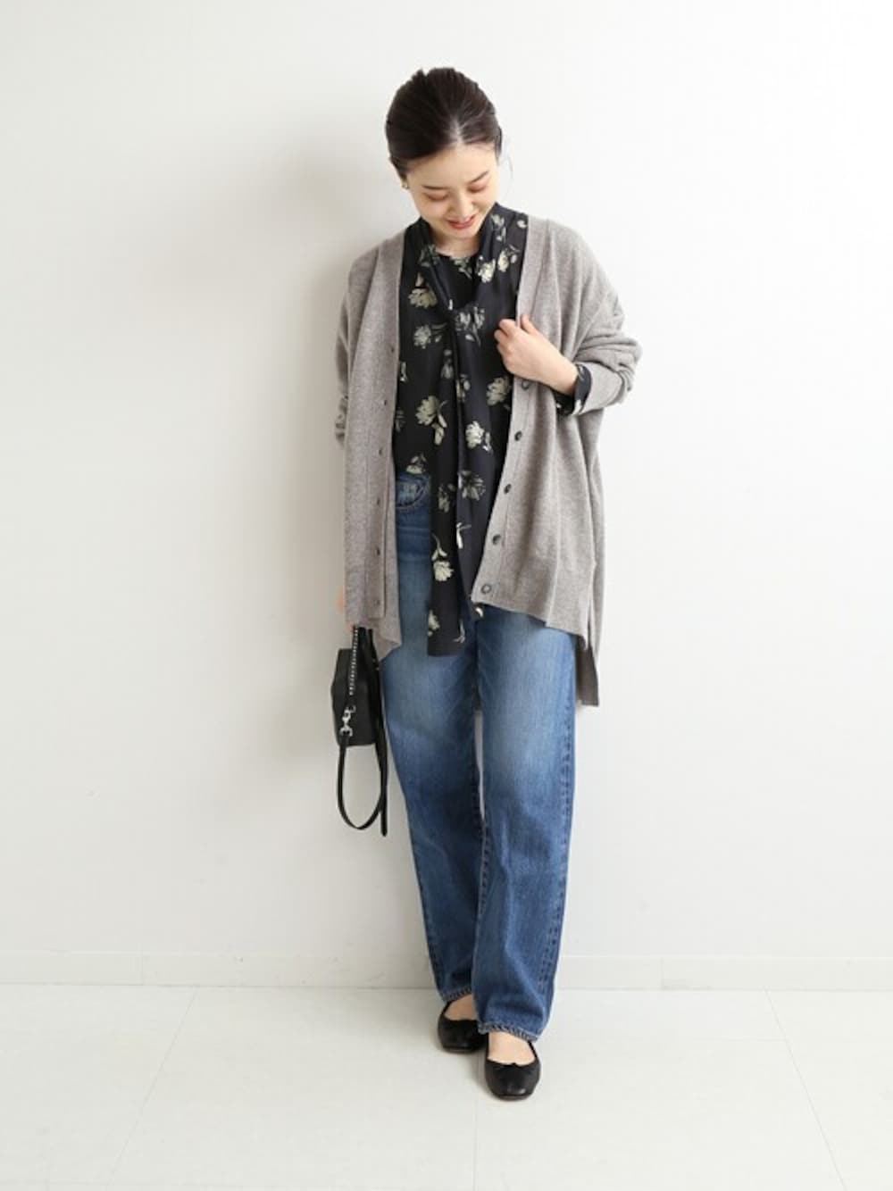 フラワープリントのボウタイブラウスはブルーデニムと合わせてヴィンテージライクに。 ボウタイはあえて結ばずラフに垂らして着るのが気分!